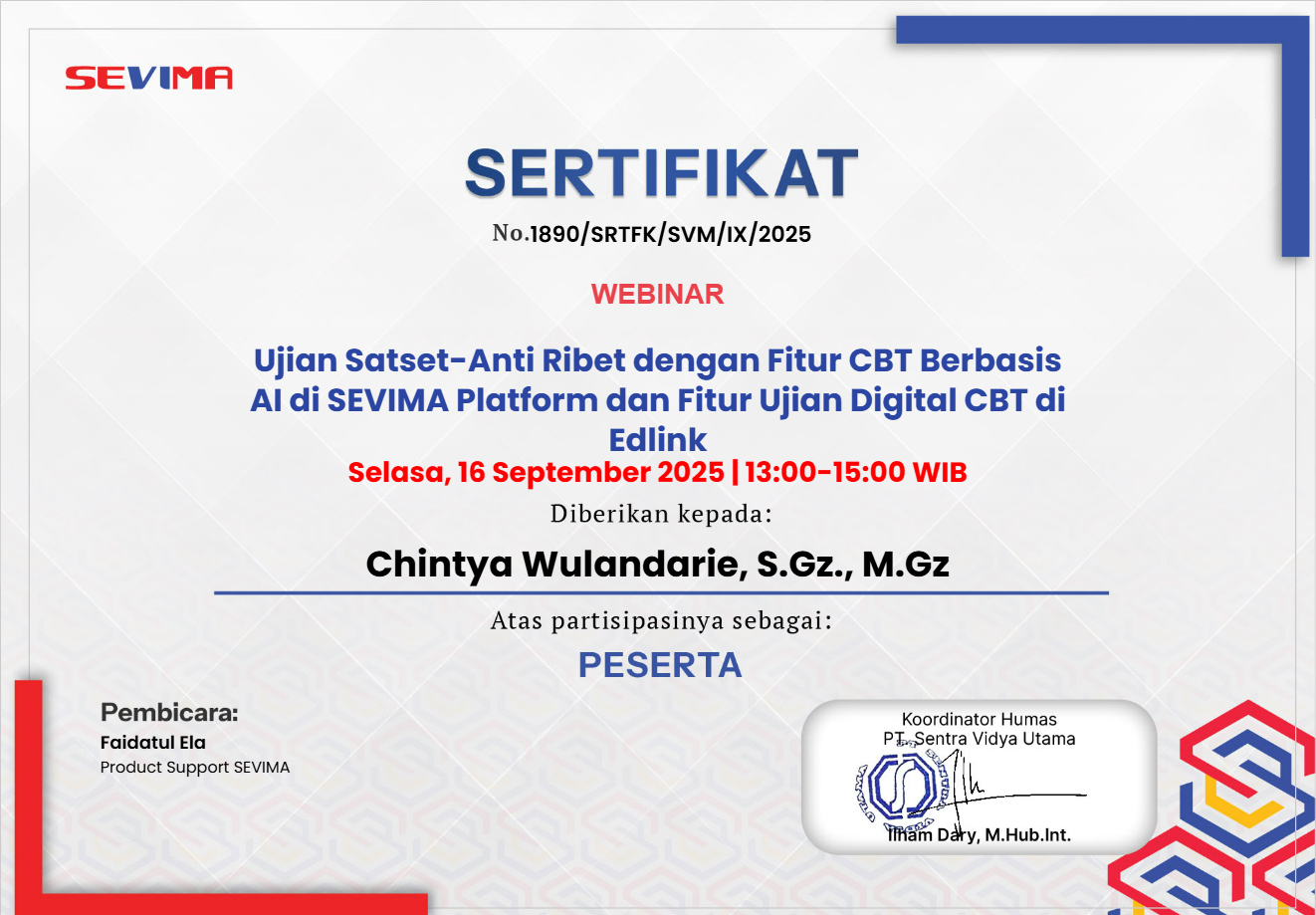 2. SERTIFIKAT Ujian Satset Anti Ribet dengan Fitur CBT Berbasis AI di SEVIMA Platform dan Fitur Ujian Digital CBT di Edlink_Chintya Wulandarie, S.Gz., M.Gz_1769674613.jpg
